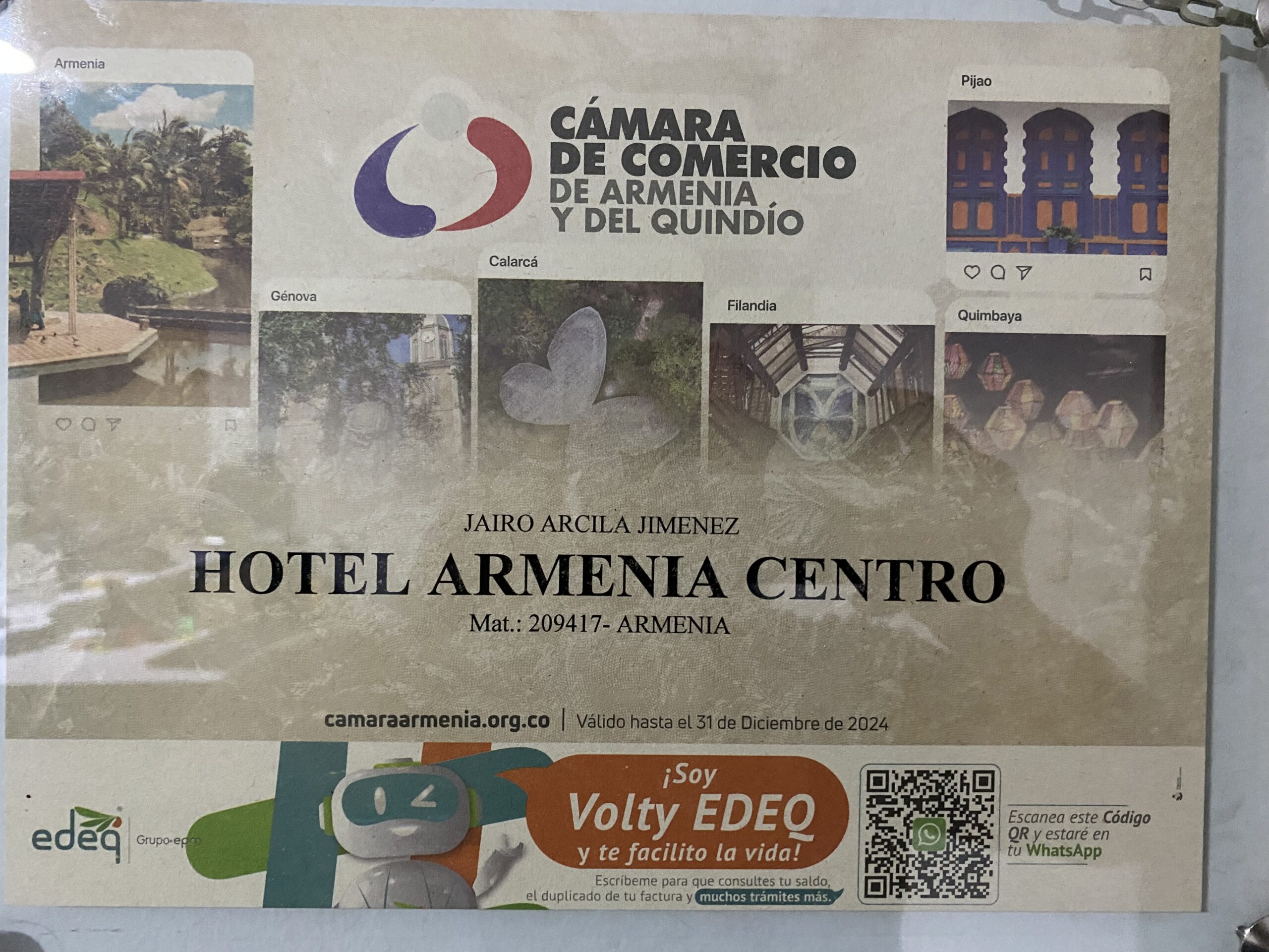 HOTEL ARMENIA CENTRO. punto de referencia centro comercial, IBG y la plaza de BOLIVAR en plena peatonal. En la fachada hay una bandera de Colombia, ubicación aseo y buena atención.